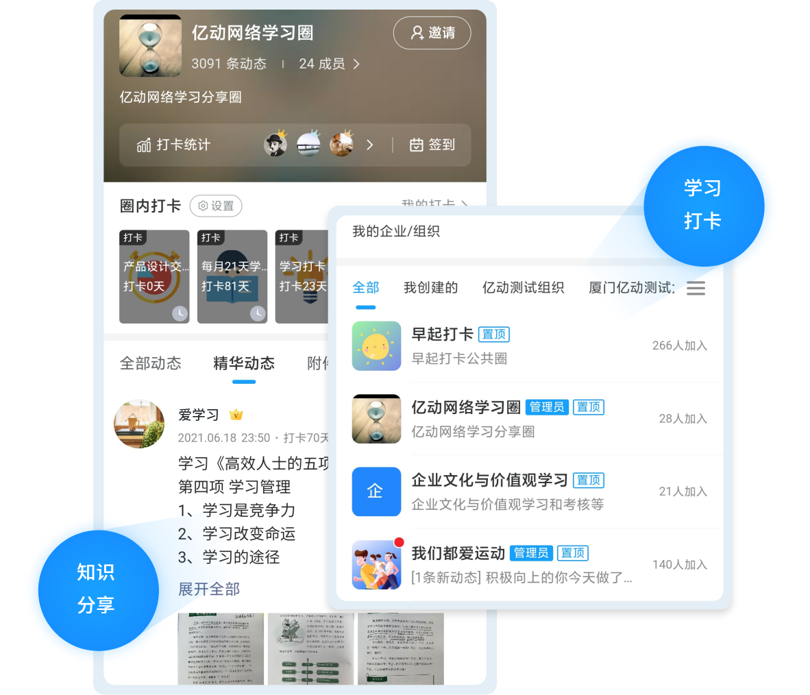 构建企业学习圈,多样动态发布方式,员工通过分享、共享学习的知识,结合互动,让员工充分展示自我才华,提高员工学习动力,为人员发展提供可靠依据。