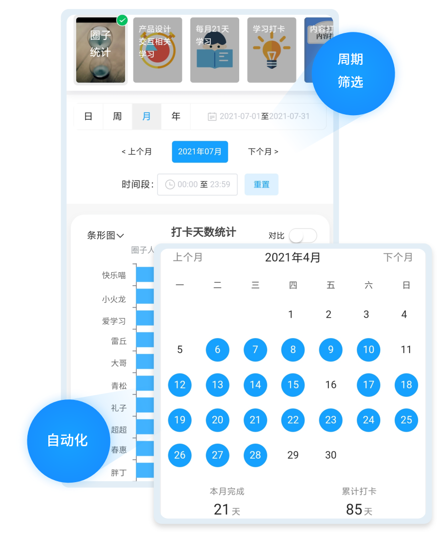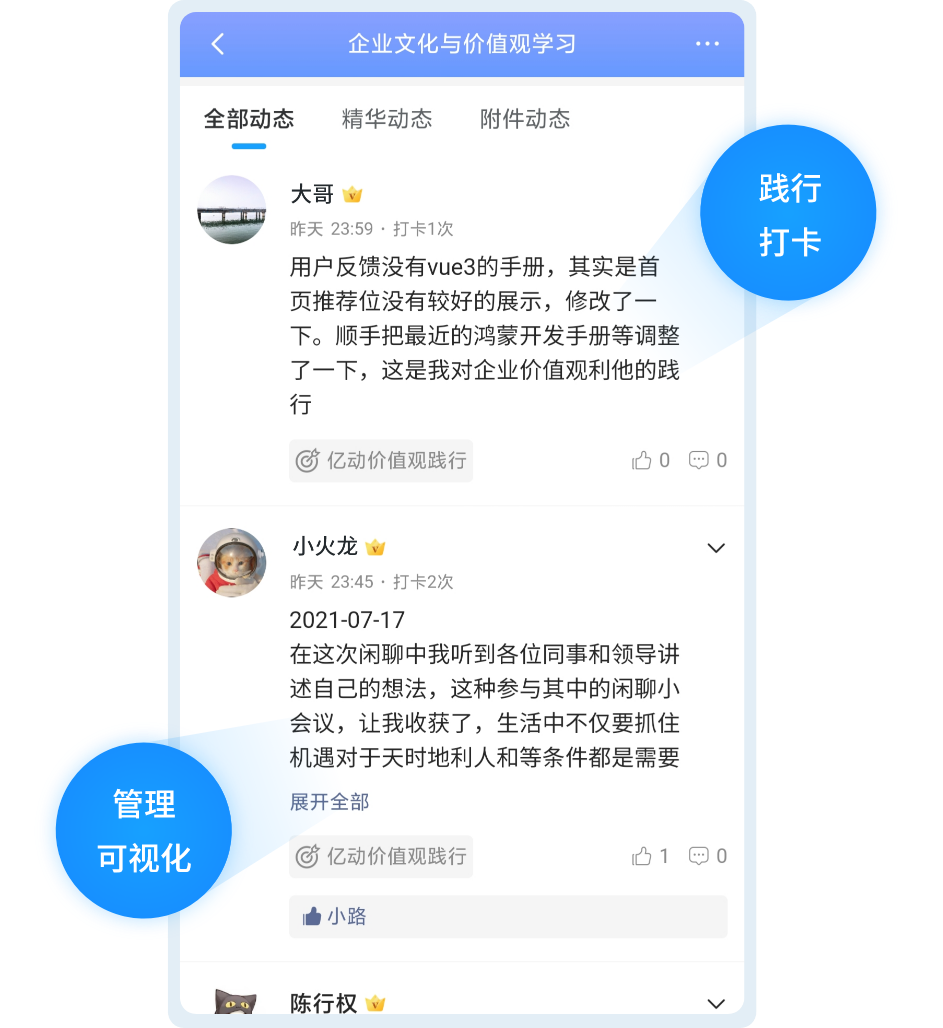 完善的个人和团队践行数据统计,节省企业统计人力和时间成本,可查看团队的总数据,也可查看个人数据,跟进员工学习践行情况。